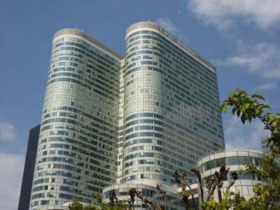 The structure contains 32 elevators and offers 350,000 square meters of office space, with direct access to La Défense Grande Arche transportation station.