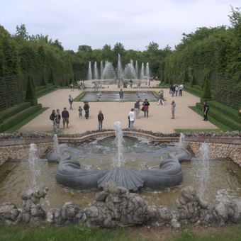 Andre Le Notre designed this garden space between 1677 and 1679, incorporating 140 water jets in the upper basin and corner fountains in the central section.