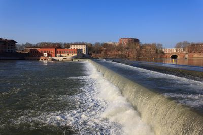 The Bazacle watermill stands on the banks of the Garonne River, featuring both historical and modern turbines that generate hydroelectric power for the city.