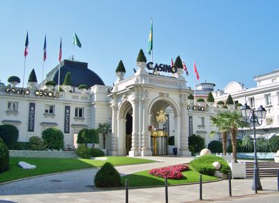 The gaming facility incorporates multiple dining venues, including Le Carré d'As restaurant with baroque decor and Le Lounge Bar with a shaded terrace.