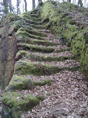 The ruins are located near the hamlet of Nohan and require a walk on rough terrain to reach the remaining fortress structures.