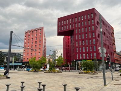 The area houses 250,000 square meters of office space, 400 residential units, and connects to multiple transportation options including trams, buses, and regional trains.