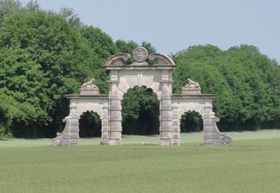 The castle features a stone portal constructed in 1908, standing as the sole remaining element of the original structure in open farmland.