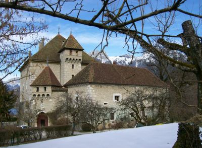 The castle's name derives from a Savoyard word meaning 'behind', indicating its geographical position in relation to the town of Duingt.