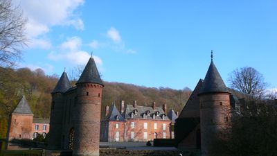 The château exhibits a combination of pink bricks with flint and sandstone construction, featuring three distinct towers on its rear facade.