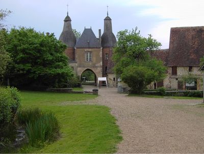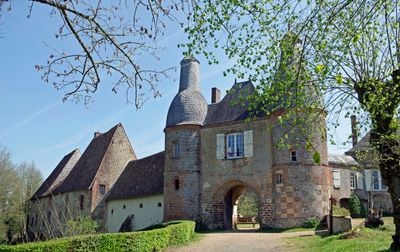 The architectural complex includes an entrance gate with two brick cylindrical towers, a church, stables, a tithe barn, and a dovecote dating from various centuries.