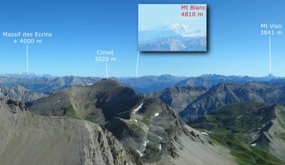 Mount Cimet rises to an elevation of 3,020 meters within the Pelat Massif, featuring steep slopes and exposed rock formations throughout its terrain.