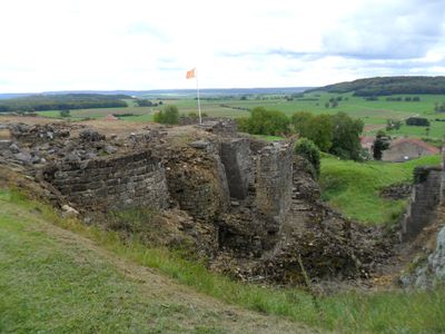 The remnants of Château de Beaufremont stand on a hilltop, featuring thick defensive walls and the remains of multiple towers within its structure.