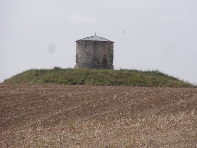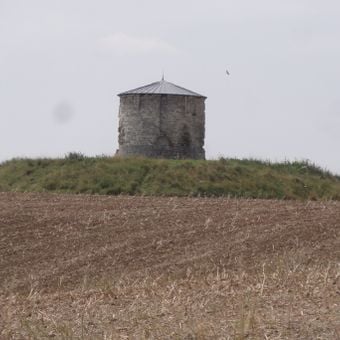 The castle features a cylindrical tower standing on a mound, with remaining foundations and deep moats measuring 40 meters wide and 10 meters deep.