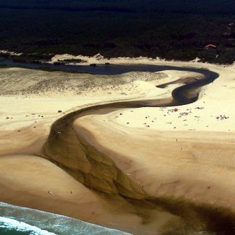 The Courant d'Huchet is a river that flows through the Landes, connecting Lake Leon to the Atlantic Ocean. The waterway winds through landscapes of sand dunes and gallery forests that line both banks.