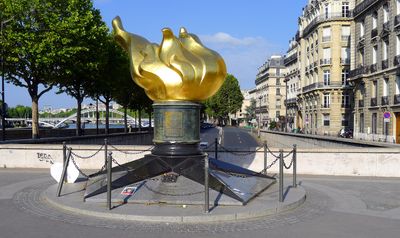 The Flame of Liberty is a sculpture in the 16th arrondissement of Paris, near the Seine and close to the Pont de l'Alma. Made of copper and covered with gold leaf, the torch rises from a low stone base and replicates the shape of the torch held by the Statue of Liberty in New York.