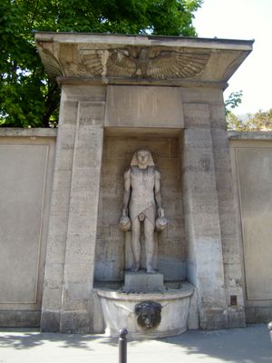 The Fontaine du Fellah features a central figure holding two water vessels, positioned against a wall with a semicircular basin at its base.