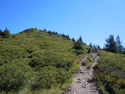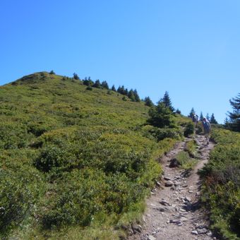 The hiking trail starts at Barioz Nordic center and extends over 11 kilometers through forest paths and alpine meadows to reach the summit.