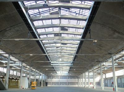 The Halle Freyssinet stretches 311 meters in length and 23 meters in height, featuring three naves with reinforced concrete columns and prestressed concrete roof.
