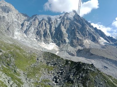 The Glacier des Pélerins extends over 2 kilometers in length between the Aiguille du Plan and Aiguille du Midi in the Mont-Blanc massif.