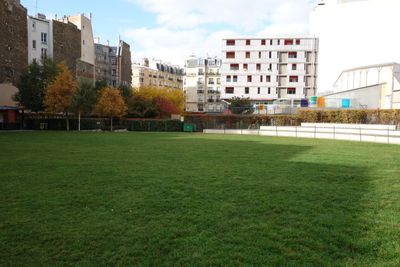 Jardin de la Folie-Titon contains walking paths and grassy areas spread across its grounds, providing outdoor recreation space in a residential district of Paris.