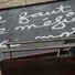 Two workers, one on the roof and another on a platform, appear to install a large blackboard displaying white text on a building wall.