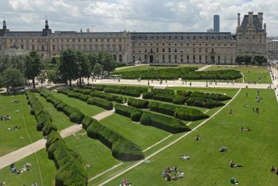 The Carrousel Garden features stone paving paths that spread from the triumphal arch, with grass areas and structured hedges forming geometric patterns.