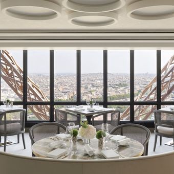 Le Jules Verne sits on the second level of the Eiffel Tower and offers views across Paris while serving contemporary French cuisine with seasonal ingredients. The dining room uses its height to create window seating with city panoramas, while the kitchen varies regional products based on the season.