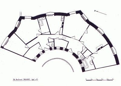 Architect Auguste Bossu constructed these two residential buildings between 1933 and 1939 on Boulevard Daguerre, addressing housing needs during the interwar period.