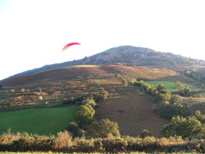 The northern slope features a paragliding center where enthusiasts launch from the mountain while herds of pottok horses roam freely below.