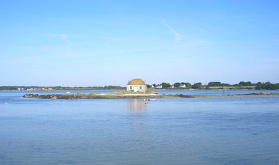 Nichtarguer is a small islet located at the mouth of the Etel River along the Breton coast. The island sits surrounded by water and displays rocky shores with low vegetation typical of this coastal region.