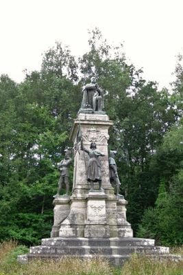 The Monument du comte de Chambord stands directly facing the Sainte-Anne basilica, featuring five statues including representations of Joan of Arc and Du Guesclin.