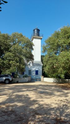 Phare de la Pointe des Dames is a white square tower standing in the Bois de la Chaise area with a residential building attached to its base. The structure rises prominently above the coastal landscape and serves as an important sea marker for vessels navigating the waters nearby.