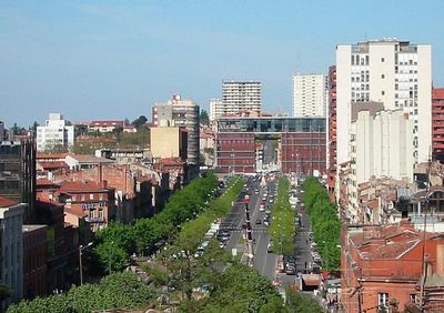 An asymmetrical arch spans Avenue Georges Pompidou, connecting two main buildings through a belvedere that offers views across Toulouse.