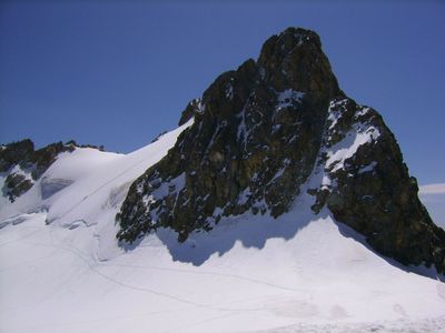 The Pic de la Grave rises to 3,628 meters above sea level, with its north face dominating the Girose glacier in the French Alps.