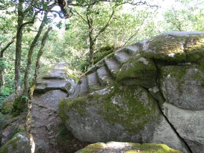 The Pierre aux neuf gradins features a granite stone structure with nine distinct steps carved into its surface, rising from the surrounding landscape.