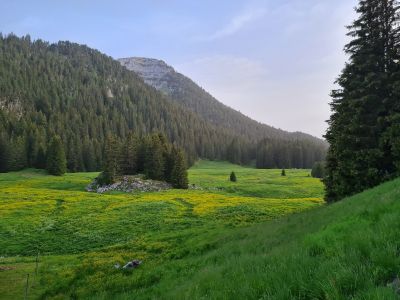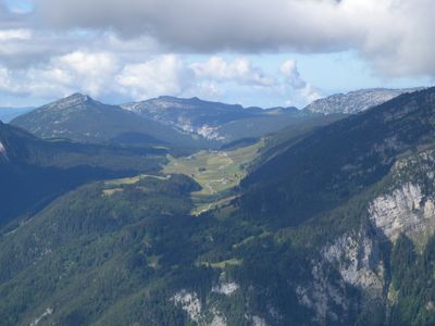 Glières Plateau is a limestone formation at about 1,440 meters elevation featuring open mountain meadows interspersed with alpine forest. The terrain includes multiple hiking routes across varied landscape with gentle slopes and forested sections.