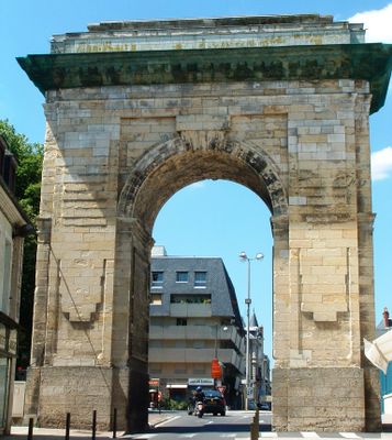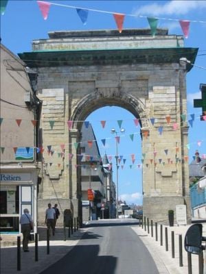 The Porte de Paris features a rounded arch design with architectural decorations and classical elements characteristic of 18th-century French construction methods.