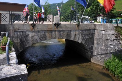 A memorial stone on the bridge presents a chronological timeline starting from the Charlemagne empire, documenting the location's historical significance through centuries.
