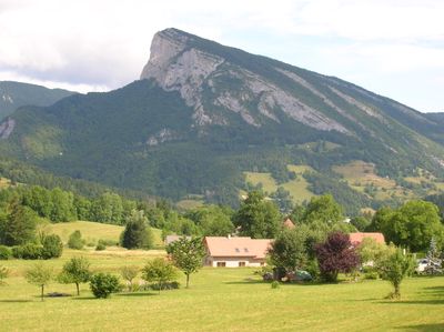 The limestone peak of Roche Veyrand rises to 1429 meters elevation between the townships of Corbel and Saint-Pierre-d'Entremont in the Chartreuse Mountains.