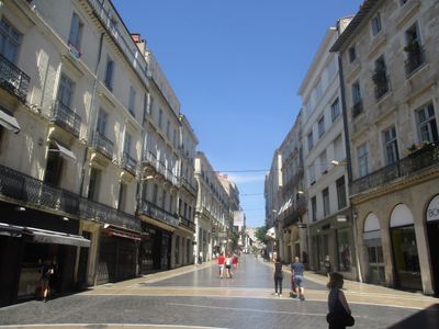 International retail chains, local boutiques, restaurants, and technology stores line both sides of this main commercial thoroughfare in central Montpellier.