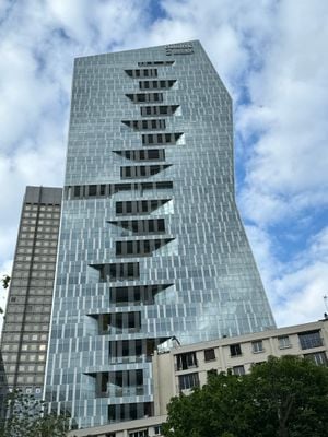 The tower incorporates modern French architectural principles with its geometric facade design and vertical metal elements across the structure.