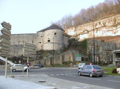 The Tour Notre-Dame rises as a circular fortification structure on the hillside of Bastion Bregille, overlooking the bends of the Doubs river.