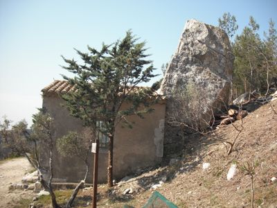 The Trémaïe chapel stands at the base of a limestone outcrop, featuring traditional Provençal architecture with stone walls and a simple bell tower.