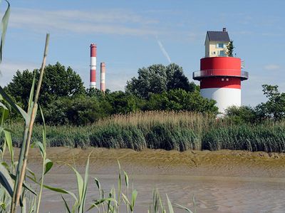 The Villa Cheminée consists of a cylindrical tower reaching 15 meters high with a residential pavilion positioned at its summit near Cordemais power plant.