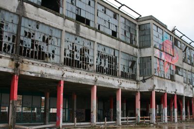 The U-shaped industrial complex spans 75 hectares with three-level buildings featuring post-and-beam construction and Art Deco elements in the eastern wing.