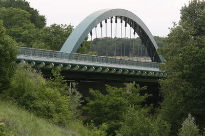 The viaduct features a single central arch with radiating cables, making it the largest span of its type in Europe at the time of construction.