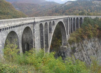 The railway bridge, completed in 1916, demonstrates the engineering methods of architect Paul Séjourné through its design with four smaller arches above the spandrels.