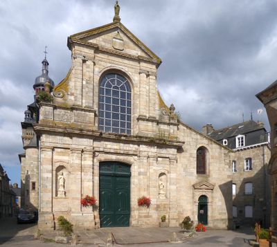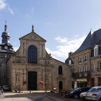 The Saint-Mathurin church features a slate-covered bell tower with a lead dome and corner pinnacles at the center of Place Penthièvre.