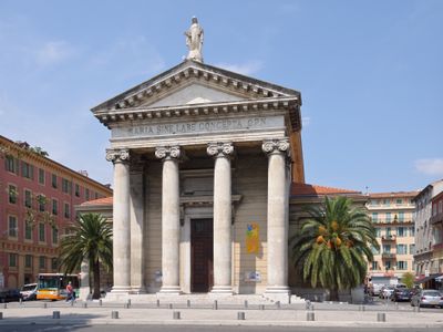 The Notre-Dame du Port church stands on Place Île de Beauté with four Ionic columns adorning its white neoclassical facade facing the Port of Nice point.