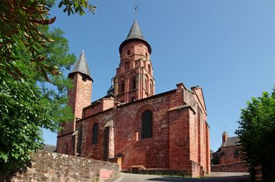 The church's red sandstone construction matches perfectly with the surrounding buildings of Collonges-la-Rouge, creating a unified architectural ensemble.