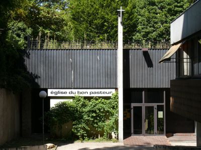 The Église du Bon-Pasteur features a modern architectural design with a spacious interior that accommodates 600 worshippers at 177 rue de Charonne.