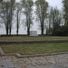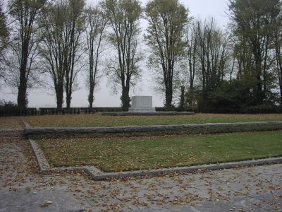 The granite memorial block stands on a circular flagstone terrace, encircled by tall maple trees within a square landscaped park near Arras.