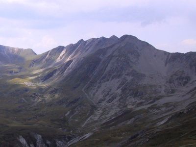 The Pic de Freser rises to 2,834 meters above sea level, featuring steep slopes and rocky terrain across the Spanish-French border in the Eastern Pyrenees.