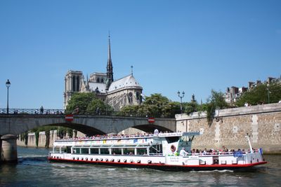 River boats depart from the oldest bridge in Paris to navigate through central Paris, offering views of Notre-Dame Cathedral and the Eiffel Tower.
